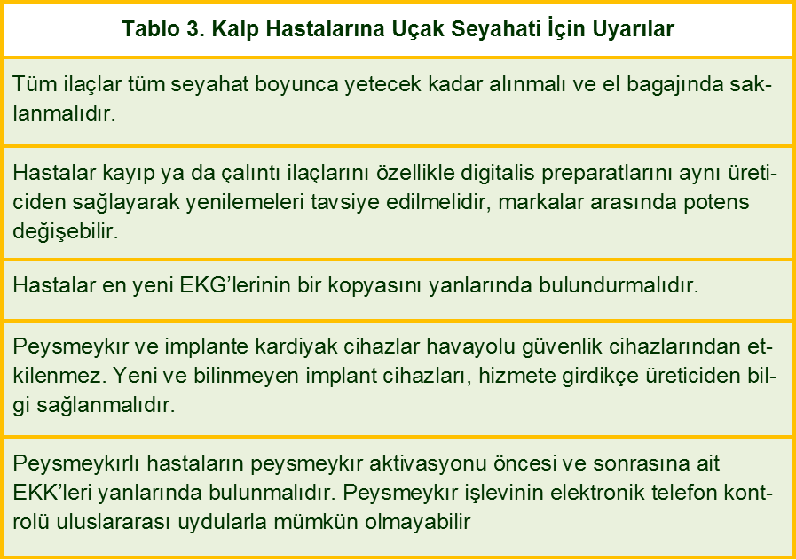 Benzer şekilde yakın zamanda koroner arter bypas greftleme yapılmış hastalar, postoperatif gidişatın stabil olduğu varsayılarak yüksek riskli kabul edilmez. Ancak herhangi bir göğüs cerrahisinin ardından düşük atmosfer basıncına maruziyetin doğasında barotravma riski olduğundan hava yolculuğunun en az iki hafta ertelenmesi tavsiye edilir. Diğer kardiyak durumlar hava yolculuğu için özellikle kontrendikasyon olmamakla beraber tıbbi stabilite, semptomlar ve seyahati komplikasyon olmadan tamamlama ihtimalinin ferden değerlendirilmesi gerekir. Tablo 2’de ticari havayolu uçuşları için Hava-uzay Tıp Birliğince önerilen kardiyovasküler kontrendikasyonlar, tablo 3’te de kalp hastaları için genel seyahat tavsiyeleri bulunuyor