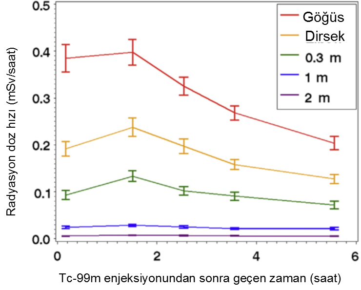 Radyasyon ölçümleri 46 hastadan iyonizan oda ve Geiger – Müller sayacı kullanılarak, MPS bitiminden hemen sonra göğüs duvarından, sağ dirsekten ve göğüs duvarının 30 cm, 1 m ve 2 m uzağından yapıldı. Hastanede yatanlarda hastaneye varışta (stres enjeksiyondan 1.51 ±0.56 saat sonra) ve varıştan 1, 2 ve 4 saat sonra ek ölçümler yapıldı. Radyasyon doz oranı bilgileri Şekil 1’de özetlendi. Ayrıca 10 hastadan film plaka dozimetresi alındı. Randyonüklid verilmesinden 1,5 saat sonra başlayan 27.6 ±8.1 dakika maruziyet için ön göğüs duvarı doz eşdeğeri 0.37 ±0.13 mSV ve yan göğüs duvarı doz eşdeğeri 0.59 ±0.26 mSv ölçüldü. 64 ekokardiyografik çalışmayı ve 44 hasta nakil kaydını esas alarak kuruluşumuzda hastanın ekokardiyografi yapanla temas süresini 24 ±8 dakika ve transport personeliyle temas süresini 10 ±6 dakika olarak hesapladık.